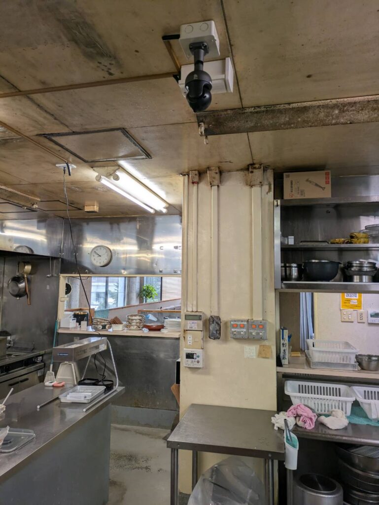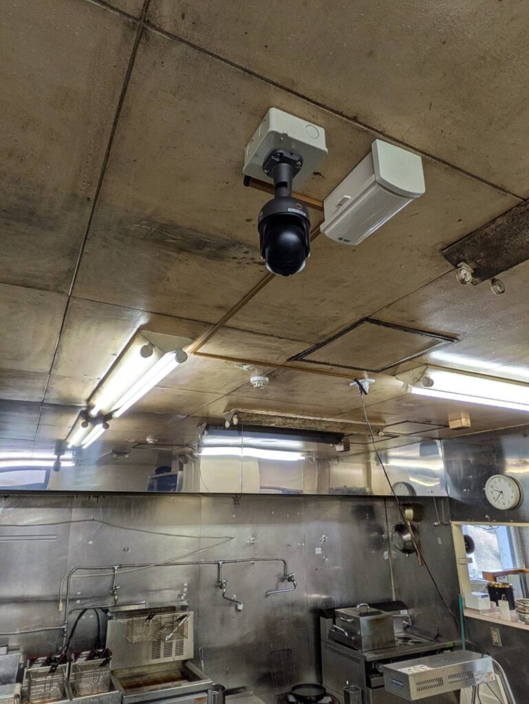 飲食店厨房の天井にカメラ設置(塚本無線みてるちゃん5PLus)